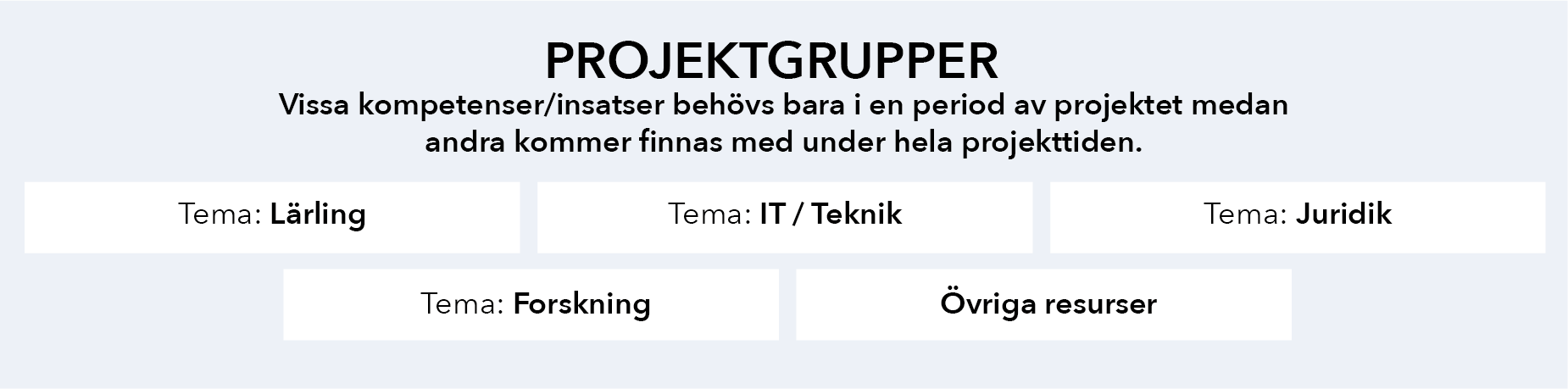 Projektet är organiserat så att beslut, samordning och genomförande hänger ihop: styrgrupp ↔ delprojektledare ↔ projektgrupp, där temagrupperna driver arbetet framåt.